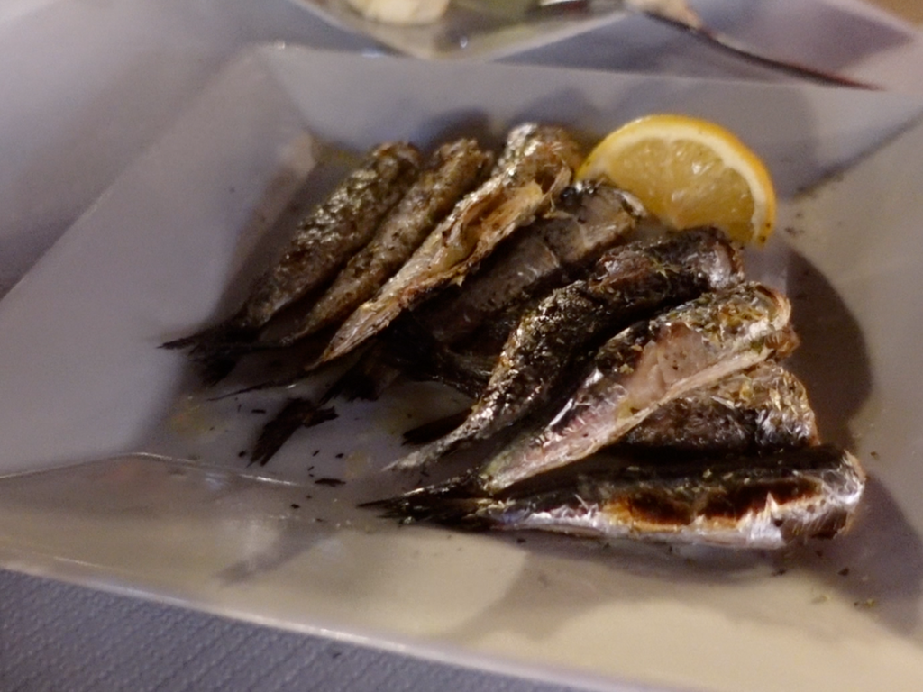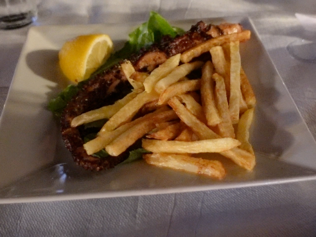 雖然照片品質不佳,但食物是好吃的。我們點希臘沙拉、烤章魚、炸魷魚等,覺得料理比中午的希臘媽媽菜,略遜一點點,但整體而言還算不錯。而且地點就位在港邊,是燈光美氣氛佳的餐廳。