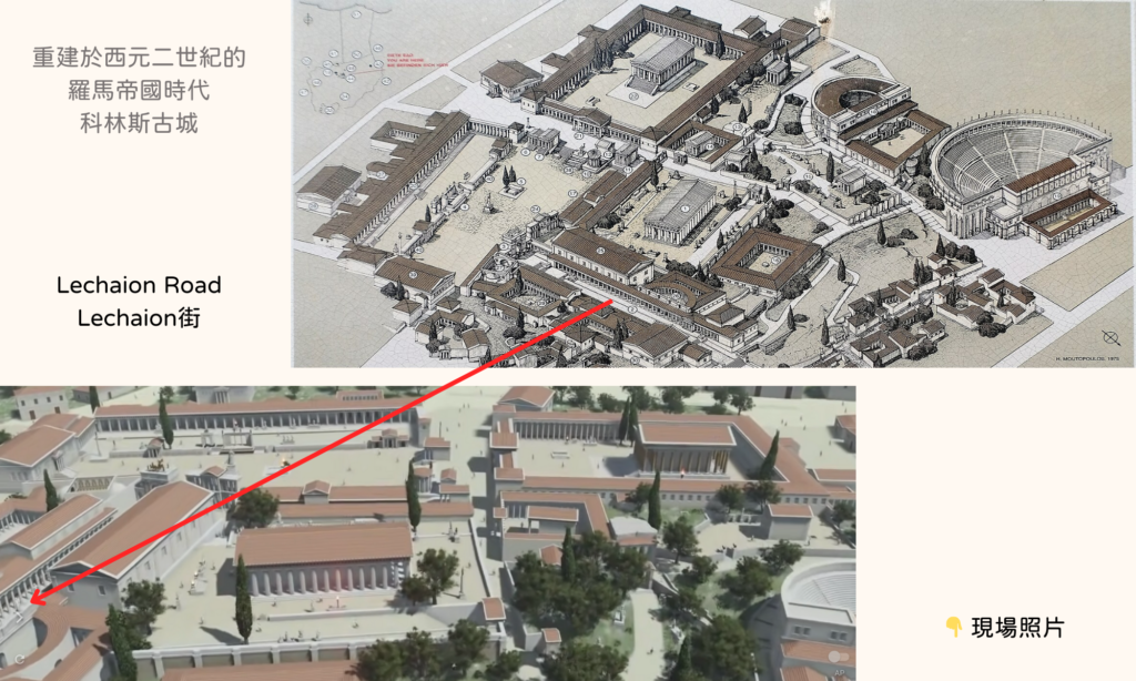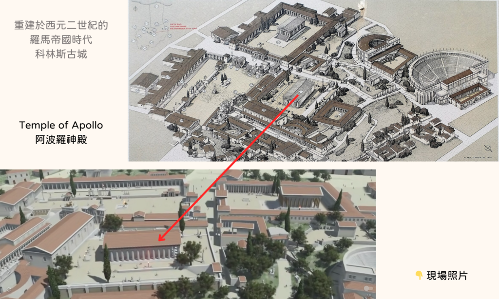 配圖中的3D圖,是我從一支名為「Ancient Corinth」的YouTube影片截取的。若有興趣,推薦看完整影片。影片除了重建西元二世紀羅馬帝國時代的科林斯古城外,還用空拍鳥瞰的角度,帶大家遊覽這座歷史名城。(我截圖的時間點,大概在1:24秒處)