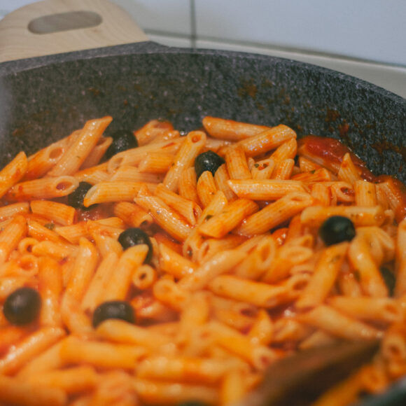 材料:橄欖油、鹽巴、黑胡椒、辣椒粉或辣椒、番茄醬(Tomato Pasata)、去籽黑橄欖、筆管麵
