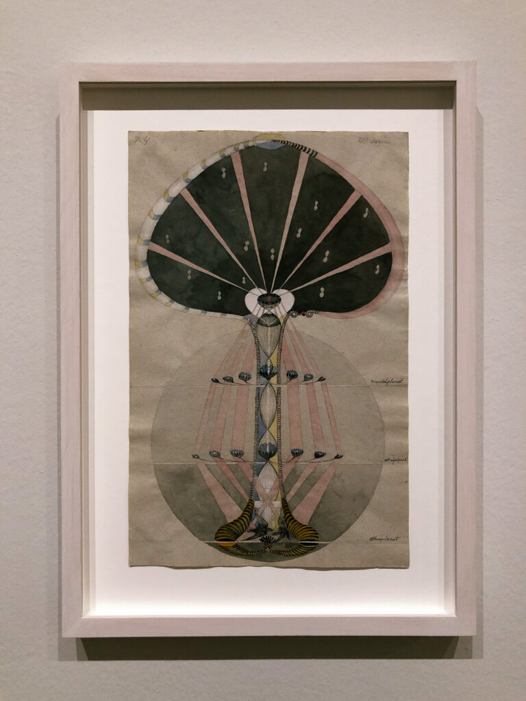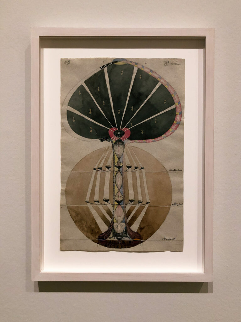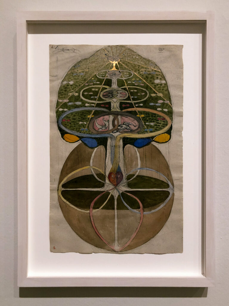 af Klint的樹系列,借鑑許多神話和宗教概念,其中一個是「世界軸心」或者說「世界之樹」概念。在北歐神話中,Yggdrasil是宇宙中心的一棵榆樹,其根深深地扎至地下,枝幹則伸向天空。此系列作品中,af Klint結合了對植物結構的科學觀察,和藝術的裝飾元素,以獨特的方式呈現自然與靈性主題。